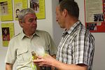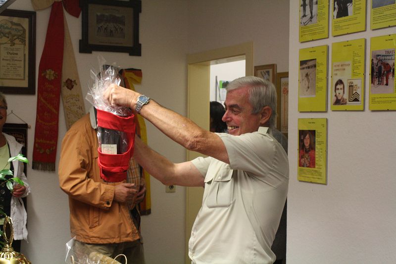 Während der Begehung der Räume wurde von mehreren anwesenden Gästen Geschenke zum "Einzug" überreicht. So zum Beispiel Blumengebinde von Hern Epperlein und Frau Gürtler - den Vertretern der Stadt Zwönitz. Auch der Vertreter des befreundeten Vereins TSV Beutha überreichten Blumen. Werner Wetzel (Volleyball) übergab einen extra angefertigten Pokal. Die Volleyballer kamen mit einem äußerst individuellen Geschenk. Falk Jenkner übergab im Namen des Vorstandes ein persönliches Geschenk an Horst Leonhardt. Zum krönenden Abschluss stellte Holger Wachtel (Leiter Grundschule) dem Verein einen PC zur Verfügung.